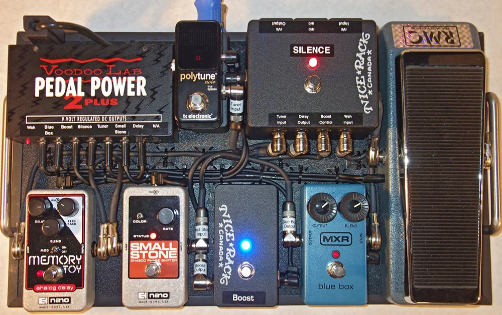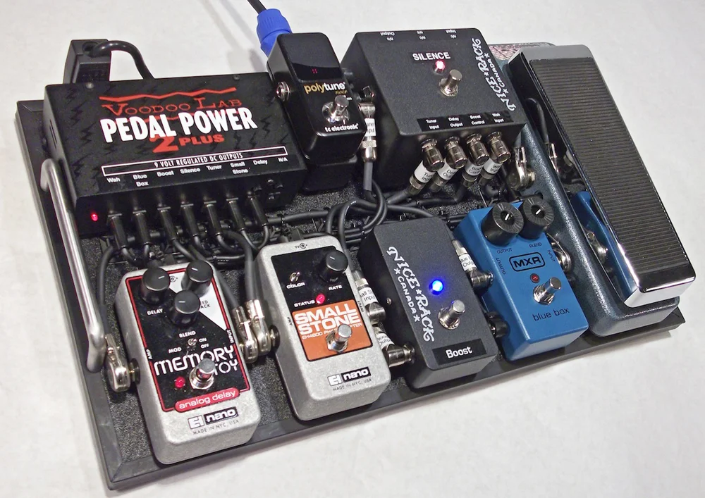 A series wired compact pedalboard that in it's road case is small enough to fit in the overhead luggage compartment on a jet.